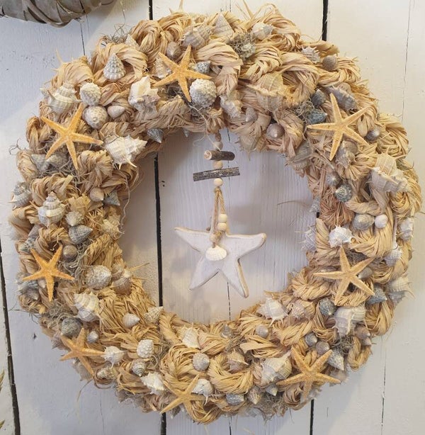 Raffia krans leuk om op te hangen, neer te leggen met een windlicht er in of om zelf te decoreren met schelpen of andere materialen. (Zie voorbeelden)